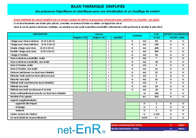 Bilan thermique simplifiée des puissances frigorifiques et calorifiques pour une climatisation et un chauffage de confort sur feuille excel.